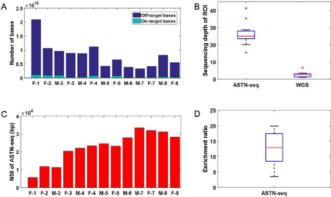 研究人員對(duì)源自8對(duì)夫婦的外周血DNA進(jìn)行ASTN-seq,并評(píng)估了測(cè)序數(shù)據(jù)的質(zhì)量,重點(diǎn)關(guān)注富集效率、測(cè)序深度、N50和富集倍數(shù)。在圖 1A 中,柱形圖描繪了 ROI 中測(cè)序的堿基數(shù)量和每個(gè)樣品中堿基總數(shù),富集效率的平均值和中位數(shù)分別為 6.96% 和 6.69%。圖 1B顯示了ASTN-seq ROI的測(cè)序深度,并將其與相同數(shù)據(jù)輸出的 WGS 測(cè)序深度進(jìn)行了比較。ASTN-seq ROI的平均值和中位數(shù)測(cè)序深度分別為 26.34× 和 25.33×,而WGS ROI 則分別為 3.26× 和 2.99×。圖 1C顯示了每個(gè)樣本在 ROI 中 ASTN-seq N50 的匯總數(shù)據(jù)。此外,富集倍數(shù)被定義為 ROI 中的測(cè)序深度與非目標(biāo)區(qū)域的測(cè)序深度的比率,如圖 1D 所示,ASTN-seq 獲得的每個(gè)樣本富集倍數(shù)的平均值和中位值分別為10.28和8.90,遠(yuǎn)高于 WGS 的理論值1。