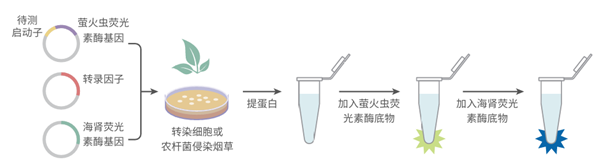 該實驗通常使用螢火蟲熒光素酶(Firefly Luciferase)和海腎熒光素酶(Renilla Luciferase)雙報告系統: