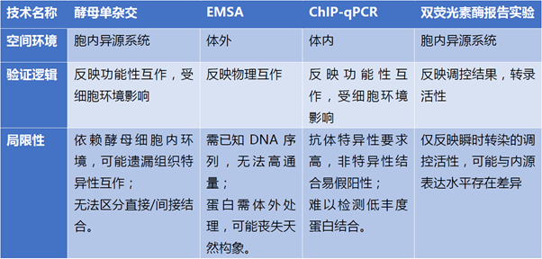 上述四種技術均可用于研究基因表達調控中的蛋白與DNA的相互作用或轉錄調控機制。然而,由于技術原理、實驗條件的差異,蛋白的活性狀態、檢測范圍及敏感度亦各有特點。為獲取更可靠的生物學結論,通常需結合多種方法,并綜合實驗體系(如體內/體外環境)、蛋白表達狀態(如天然構象/重組蛋白)等具體條件進行數據整合分析。