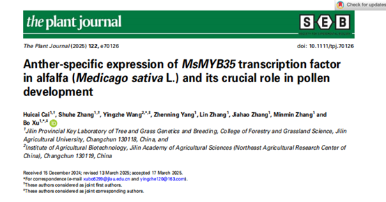 2025年3月17日,吉林農業大學徐博教授團隊在Plant Journal發表了題為“Anther-specific expression of MsMYB35 transcription factor in alfalfa (Medicago sativa L.) and its crucial role in pollen development”的研究論文。該研究聚焦紫花苜蓿中MsMYB35基因,借助DAP-seq技術首次在全基因組范圍內鎖定其結合位點,揭示了該基因通過茉莉酸信號通路和細胞壁重塑通路調控花藥發育的分子機制,為解析苜蓿花藥發育的調控機制及分子育種提供理論依據。