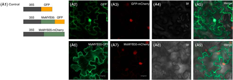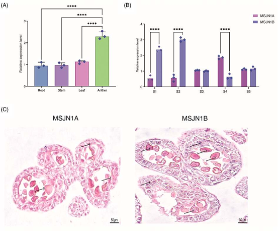 研究發現,紫花苜蓿MsMYB35基因在花藥中表達量顯著高于根、莖、葉,且在雄性不育系MSJN1A的小孢子母細胞和四分體時期表達量低于保持系MSJN1B。原位雜交顯示,該基因轉錄本從小孢子母細胞期至成熟花粉期存在于小孢子與絨氈層細胞,推測在花藥發育早期(尤其四分體時期)起重要作用。MsMYB35屬于R2R3-MYB轉錄因子家族,其N端含經典R2R3結構域。系統發育分析顯示,MsMYB35與蒺藜苜蓿(MtMYB35)、大豆(GmMYB35)等物種的同源蛋白進化關系密切,功能保守,可能參與花藥發育和花粉形成。亞細胞定位顯示其定位于細胞質和細胞核(以核膜為主),表明其可能通過調控核內轉錄及胞質過程參與花藥發育調控。