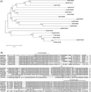 圖2. 紫花苜蓿MsMYB35的氨基酸序列比對與系統發育分析。