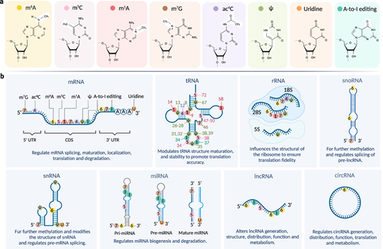 表觀轉錄組(Epitranscriptome)指RNA分子上所有可逆化學修飾的集合,這些修飾不改變RNA序列,但可以通過調(diào)控基因表達(如翻譯、降解、剪接等)發(fā)揮作用。RNA修飾廣泛存在于各種RNA類型中,包括mRNA、tRNA、rRNA、snRNA、snoRNA、miRNA、siRNA、piRNA和lncRNA等。目前已知的 RNA修飾超過150種,常見類型包括甲基化(如m6A、m5C)、羥基化、假尿苷化(Ψ)等。其中RNA甲基化是最常見的修飾類型之一,在mRNA、tRNA等分子中占比較高(如哺乳動物 mRNA 中 m6A 修飾可占甲基化修飾的 80% 以上)。