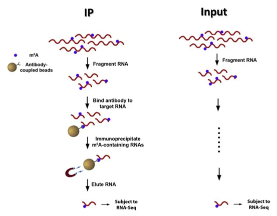 MeRIP-seq是基于免疫沉淀富集技術,該技術包括IP和input兩個文庫:IP文庫是通過m6A特異性抗體富集含甲基化修飾的RNA片段,用于檢測m6A修飾的分布;Input文庫為未進行免疫沉淀的RNA樣本(處理流程與IP一致),作為對照用于排除非特異性結合。 通過比較IP與Input文庫的測序信號,可繪制全基因組范圍內(nèi)的m6A修飾圖譜,單獨的input文庫可視為RNA-seq文庫,可用于進行表達圖譜的分析。