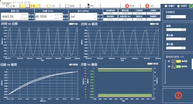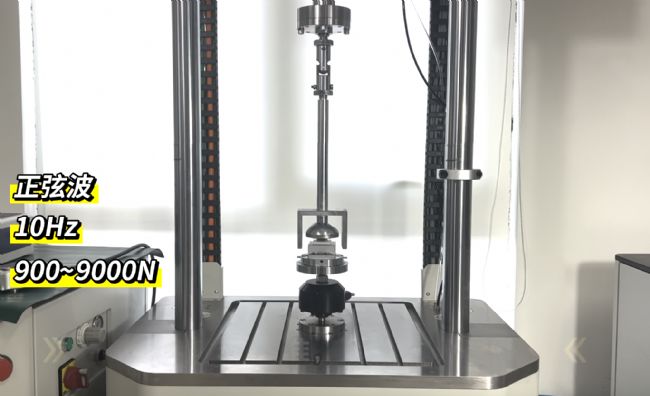 此次對鈦合金椎間融合器樣品進行動態壓縮測試,測試機型為電磁疲勞試驗機5110(最大動態載荷10000N),根據YY/T 0959標準,條件為動態壓縮載荷900~9000N,壓縮頻率10Hz,測試循環數為500萬次(約138個小時)。整個測試過程無停機現象,正旋曲線光滑穩定。達到令人滿意的效果。