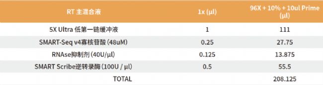 1. 將下列試劑按如下順序室溫添加到1.5 ml無核酸酶管中,務必在使用前最后添加SMARTScribe™II逆轉錄酶。上下輕輕混合。為了生成足夠96次反應的主混合物,使用多10%體積的試劑,以及10uL灌注體積 進行溢出反應。