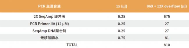 1.將下列試劑在1.5uL管中冰上混合。務必在使用前最后添加SeqAmp™DNA聚合酶。上下吹打輕輕混合。上下輕輕混合。為了生成足夠96次反應的主混合物,使用足夠進行12個溢出反應的試劑量(即總共108個反應)。