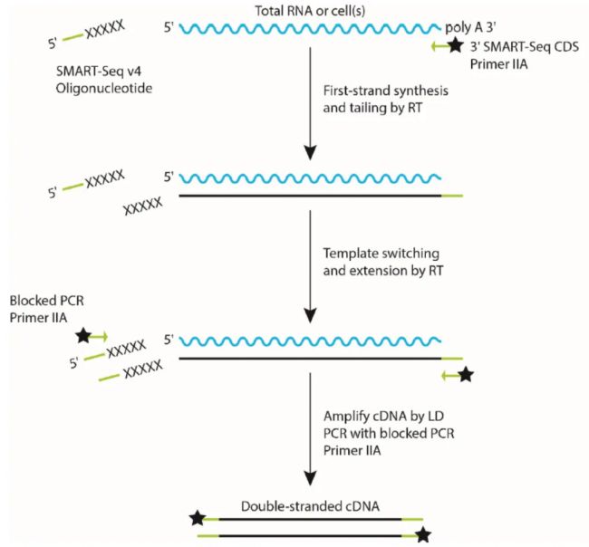RT從使用mRNA作為模板轉(zhuǎn)變?yōu)槭褂肧MART 寡核苷酸進(jìn)行進(jìn)一步的cDNA合成。這確保了mRNA的5‘端 被捕獲,并允許特定的序列被添加到cDNA的每個端,以更簡單的擴(kuò)增和豐富全長cDNA。