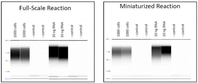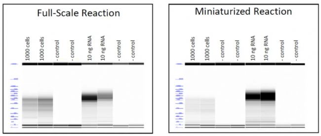 圖3.電泳圖,顯示了用于全反應(yīng)和小型化反應(yīng)的cDNA產(chǎn)物的等量分布。