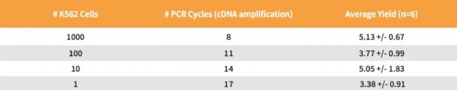 小型化的cDNA合成和文庫制備條件用于分別使用8、11、14、17個PCR周期處理1000個、100個、10個、1個 細(xì)胞樣品的遞減輸入細(xì)胞(K562),如果樣品中含有細(xì)胞,從減少的數(shù)量中擴(kuò)增cDNA產(chǎn)物。