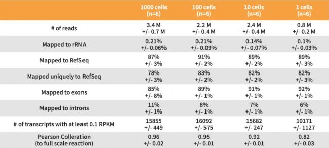 表6. 使用小型化樣品準(zhǔn)備條件減少細(xì)胞數(shù)量的RNA-Seq數(shù)據(jù)分析。