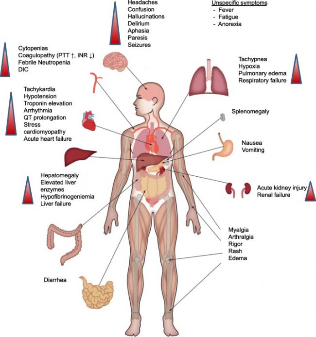 神經(jīng)系統(tǒng):發(fā)生率較高,癥狀包括意識模糊、失語、癲癇、腦病甚至腦水腫,與內皮激活導致的血腦屏障破壞相關。