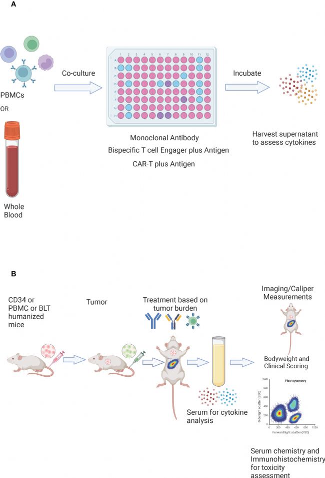 在CAR-T細胞療法的臨床前安全性評估中,細胞因子釋放綜合征(CRS)的檢測主要依賴體外與體內模型結合的策略。