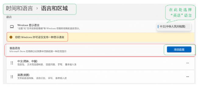 通過“開始->設置->時間和語言->語言和區域->語言”,打開語言設置界面;在“Windows顯示語言”的右邊框選擇“英語”顯示語言,如只有“中文”一種顯示語言,可以通過“添加語言”方式,從網上下載需要的英語語言包。