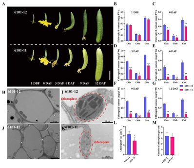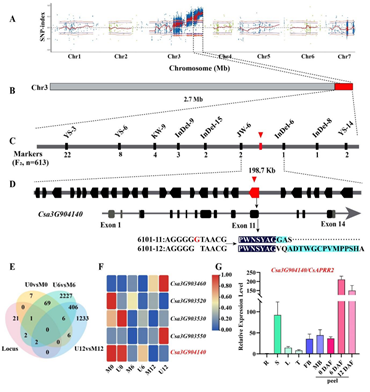 研究團隊通過多代自交培育出僅皮色不同的近等基因系6101-11(黃皮)和6101-12(綠皮)。表型分析顯示,兩者從開花當天起葉綠素含量出現顯著差異;電鏡觀察表明,6101-11因葉綠體發育異常導致葉綠素合成減少而呈黃色。遺傳分析證實黃皮為單基因隱性性狀,通過BSA-seq分析,在3號染色體末端定位到2.73Mb區間,再經Indel標記篩選將目標基因縮至198.7kb區域。結合RNA-seq分析,從3959個差異基因中篩選出5個候選基因,其中Csa3G904140(CsAPRR2)因單堿基插入導致C端缺失101個氨基酸、丟失Golden2-Like結構域,且與甜瓜皮色調控基因CmAPRR2親緣關系近,確定其為調控黃瓜皮色的候選基因。