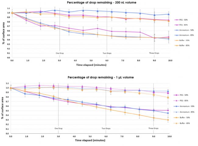 1μL時的液滴損失略低,在18%至25%之間變化。6.3分鐘后,在200 nL /1μL液滴中,PEG的液滴損失增加至42/41%,硫酸銨的液滴損失增加至52/43%,緩沖液的液滴損失增加至55/48%。