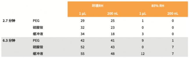 在設(shè)置為環(huán)境RH或85%RH(由NT8濕度控制室確保)的控制上,隨時間監(jiān)測結(jié)晶液滴的大小。在環(huán)境相對濕度下,開始制備孔板后的1.8分鐘內(nèi),對于所有測試條件,200 nL的25%的滴液和1μL的15%滴液已蒸發(fā)(圖1)。2.7分鐘后,大概是分配一個每孔1滴的96-孔板所需的時間,對于200 nL液滴,蒸發(fā)了29% 的PEG,32%的硫酸銨和39%的緩沖液條件(表1)。