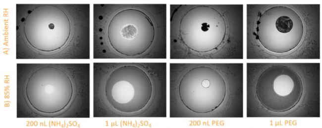 圖2. A)環(huán)境RH為50%,B)孔板制備10分鐘后,相對濕度為85%。從左到右依次為200nl,1μL硫酸銨條件,200nl, 1μL PEG條件。