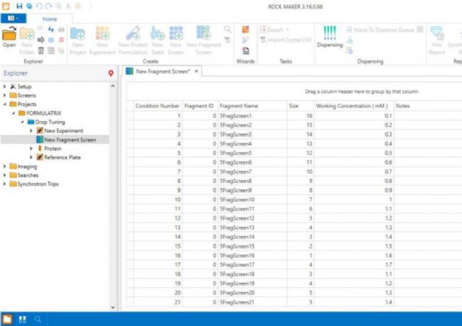 ROCK MAKER是一款功能強大的軟件,用于設計各種結晶實驗。該軟件已擴展了其功能,可以使用片段和配體輕松創(chuàng)建共結晶實驗。該功能對于使用小分子片段進行基于結構的藥物發(fā)現(xiàn)的研究人員特別有用。現(xiàn)在只需點擊幾下即可創(chuàng)建這些復雜的實驗。