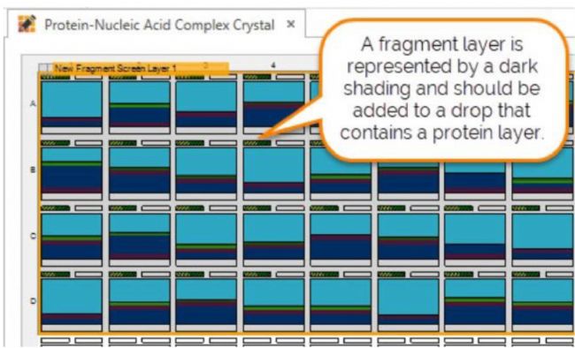 在ROCK MAKER中,片段層定義了一個片段,該片段將被添加到實驗的液滴中。用戶可以選擇在將蛋白質(zhì)液滴添加到蛋白質(zhì)層之前或之后添加片段層。ROCK MAKER中的分層系統(tǒng)使用戶能夠輕松創(chuàng)建復雜的篩選實驗,因為用戶可以在平板畫布上以圖形方式勾勒出他們的實驗組件應該放在的位置。如右圖所示,片段層由蛋白質(zhì)層頂部的深色陰影以圖形方式表示。
