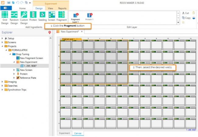 在ROCK MAKER中設計蛋白質(zhì)結晶實驗時,可以將多個片段添加到所需的實驗中。創(chuàng)建片段層涉及指定目標孔滴和選擇片段篩選條件。只需在孔板畫布上選擇片段篩選應用到的孔,然后選擇所需的片段即可完成此操作。可以添加多個片段層來創(chuàng)建所需的實驗。這是設計復雜片段篩選的一種快速簡便的方法,同時將所有實驗數(shù)據(jù)保存在一個地方。