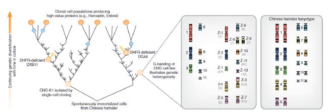 分支圖說明了 CHO 細胞譜系的概念。每個分支都會導致可能具有不同基因組的新細胞系。藍色圓圈表示用于識別適應懸浮培養和無血清培養基的細胞的選擇程序。黃色的“閃電”表示誘變和篩選產生了兩種 DHFR 缺陷細胞系。