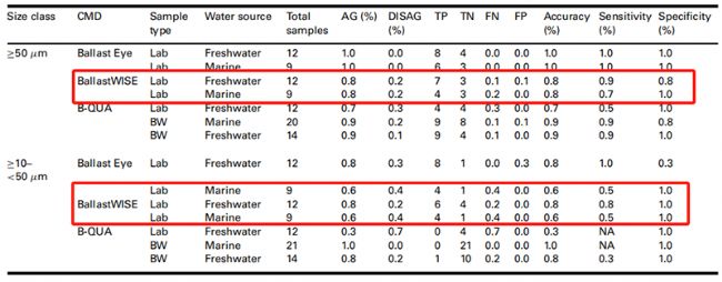 在特異性方面,BallastWISE同樣表現出色。對于≥50μm和≥10且<50μm的活體生物,BallastWISE在淡水和海水樣本中的特異性均超過了80%,這意味著其能夠準確區分活體生物與非生物顆粒,減少誤報和漏報的可能性。