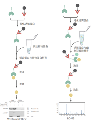 Pull-down實驗是體外研究蛋白質相互作用的經典方法,基于親和層析原理,能捕獲并鑒定與目標蛋白(誘餌蛋白)相互作用的其他蛋白。流程為:先將誘餌蛋白與特定標簽(如GST、His、Halo、Flag等)融合表達,利用親和層析純化融合蛋白,隨后,將純化的融合蛋白通過標簽與固相支持物上配體特異性結合(如GST融合蛋白與谷胱甘肽瓊脂糖珠結合),形成固定化的誘餌蛋白。然后將含獵物蛋白的細胞裂解液或蛋白溶液,與固定化誘餌蛋白孵育,通過洗去未結合蛋白,捕獲具有相互作用的蛋白復合物。最后洗脫分離結合的蛋白復合物,可使用Western Blotting驗證已知互作蛋白或質譜分析篩選未知互作蛋白。