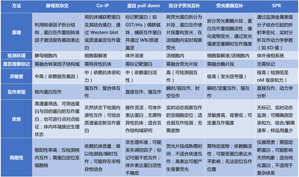 上述介紹了6種常用的蛋白質互作研究方法。不同技術的檢測原理、實驗條件及靈敏度存在差異,可能導致結果不一致。建議根據研究目標(如篩選、驗證、定量或定位)和樣品特性(如蛋白亞細胞定位、互作強弱),選擇單一方法或聯合多種技術交叉驗證。