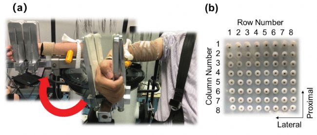 圖2. 實驗裝置。(a) 由等速測力計執行的從初始位置到末端位置的肘關節被動拉伸。(b) 以 8 行 ×8 列排列的 64 個高密度表面肌電電極
