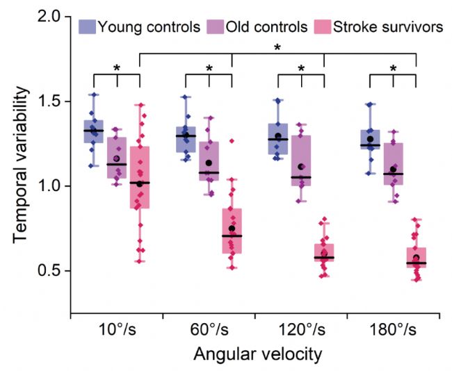 圖3展示了三組在不同拉伸速度下的時間變異性。任意兩組之間的變異性均存在顯著差異。然而只有腦卒中幸存者的時間變異性對拉伸速度高度敏感,且表現出隨著速度增加而顯著降低的現象。