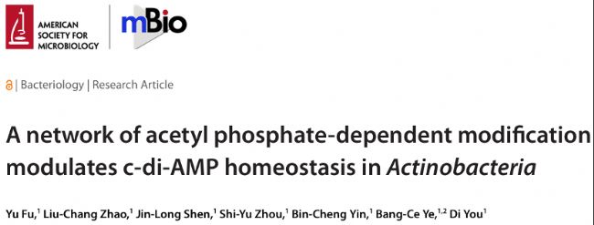 標題:A network of acetyl phosphate-dependent modification modulates c-di-AMP homeostasis in Actinobacteria(乙酰磷酸依賴的修飾網絡調控放線菌中c-di-AMP穩態)