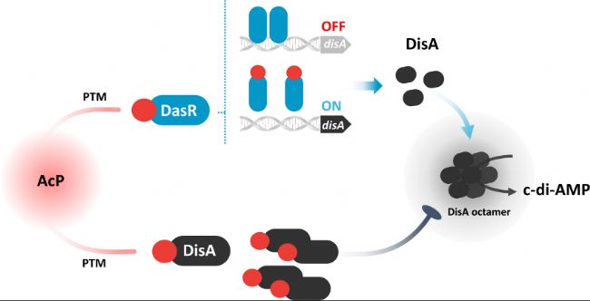 c-di-AMP鑒定對于細菌生長和細胞生理是必需的,因此本研究的主要挑戰是細胞信號和刺激如何進入決定c-di-AMP濃度的決策過程,以及這些信息如何整合到調控通路中。研究以S. erythraea為模型驗證了AcP依賴的DisA乙酰化及其轉錄抑制因子DasR參與協調環境信號和細胞內信號,這對于c-di-AMP穩態至關重要。
