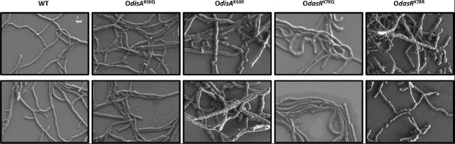 S. erythraea野生型(WT)、過表達DisAK66Q(OdisAK66Q)、過表達DisAK66R(OdisAK66R)、過表達DasRK78Q(OdasRK78Q)和過表達DasRK78R(OdasRK78R)菌株在30°C下于R2YE agar上培養96小時后的掃描電子顯微照片。圖像放大倍數為×5000。兩次重復實驗中結果相似的代表性圖片。