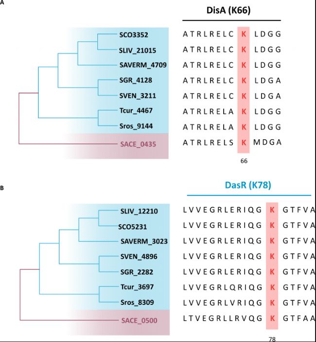 對以下物種的DisA(A)和DasR(B)蛋白序列進行了比對:青鏈霉菌(Streptomyces lividans)、天藍色鏈霉菌(Streptomyces coelicolor)、阿維鏈霉菌(Streptomyces avermitilis)、灰色鏈霉菌(Streptomyces griseus)、委內瑞拉鏈霉菌(Streptomyces venezuelae)、紅孢鏈霉菌(Streptosporangium roseum)、熱單胞菌(Thermomonospora curvata)以及紅色糖多孢菌(S. erythraea)。所有物種中保守的賴氨酸殘基以紅色加粗顯示。