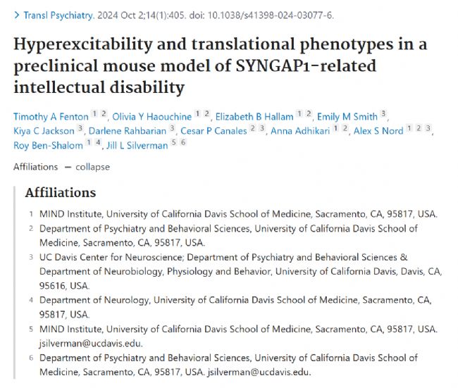 Fenton TA, Haouchine OY, Hallam EB, et al. Hyperexcitability and translational phenotypes in a preclinical mouse model of SYNGAP1-related intellectual disability. Transl Psychiatry. 2024 Oct 2;14(1):405. doi: 10.1038/s41398-024-03077-6.