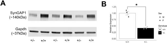 圖1:Syngap1+/-小鼠SynGAP1蛋白表達顯著降低