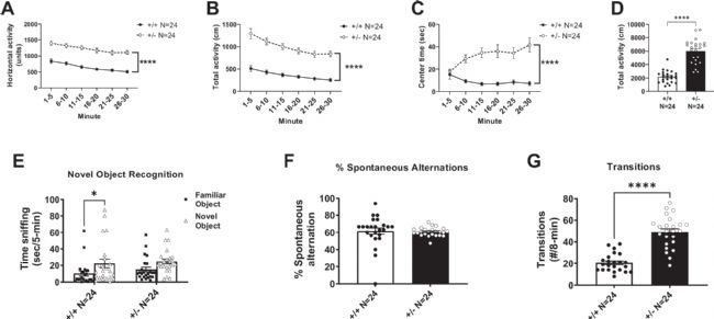 A水平活動、B總活動量和C中心區域停留時間均顯著增加(重復測量ANOVA)。D 30分鐘總活動量比較(t檢驗)。E新物體識別測試中突變鼠未表現偏好。F自發交替任務正確率無差異。G臂間轉換次數顯著增多(t檢驗)。P<0.05,***P<0.0001。