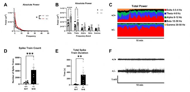 研究結果顯示,與野生型小鼠相比,突變小鼠表現出顯著的腦電圖異常:72小時連續監測發現其絕對功率譜密度(PSD)整體升高,特別是Delta波(0.5-4Hz)和Theta波(5-9Hz)功率顯著增強,同時棘波串數量和持續時間明顯增加,這些發現提示Syngap1單倍劑量不足導致神經元網絡過度興奮。