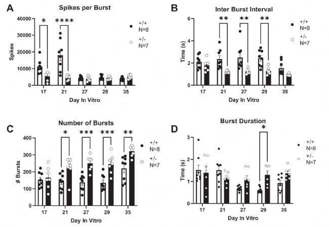 研究發現Syngap1單倍劑量不足導致神經元網絡活動顯著增強,表現為:動作電位形態改變、爆發式放電活動增多、爆發間隔縮短等特征性改變。具體而言,突變神經元雖然每次爆發包含的放電次數減少,但爆發頻率在培養第21天(DIV21)后持續增加,爆發間隔時間從DIV21開始顯著縮短,至DIV29時爆發持續時間也明顯延長。