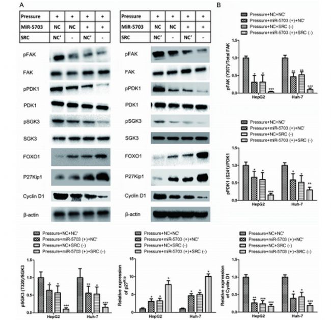 研究壓力對SRC-FAK-FOXO1 信號通路誘導(dǎo)細(xì)胞增殖的影響。結(jié)果發(fā)現(xiàn)15 mmHg壓力負(fù)荷促進肝癌細(xì)胞中 SRC、FAK、PI3K、SGK3 表達,抑制 FOXO1 和 P27Kip1 表達(圖4)。且使 pSRC、pFAK、pPDK1、pSGK3 表達上調(diào),說明壓力不僅 在mRNA 水平上增加影響相關(guān)基因轉(zhuǎn)錄,還激活蛋白磷酸化,同時 PDK1 的 mRNA 表達不受壓力調(diào)控但蛋白可被磷酸化。對受壓細(xì)胞分別用赫比霉素 A(pSRC 抑制劑)、Gsk2256098(pFAK 抑制劑)、LY294002(PI3K 抑制劑)、PHT-427(PDK1 抑制劑)和 EMD638683(SGK3 抑制劑)進行處理并檢測級聯(lián)反應(yīng)中上下游蛋白關(guān)系。此外,miRNA-5703 過表達或 SRC 敲低會抑制下游蛋白表達,揭示了 miRNA-5703 抑制腫瘤生長的機制(圖5)。