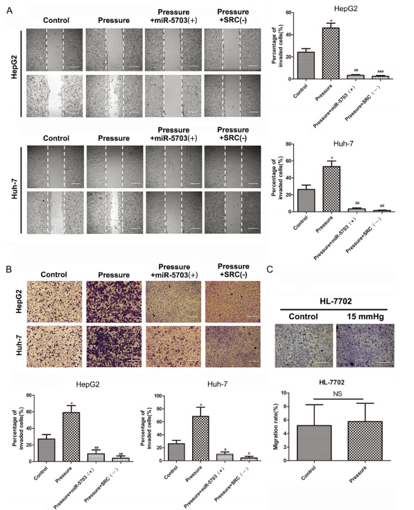 接下來,研究miRNA-5703 過表達對壓力誘導(dǎo)的肝癌細(xì)胞遷移和侵襲的影響。研究將 HepG2 和 Huh-7 細(xì)胞系依條件分為對照組、壓力組、壓力 + miRNA-5703(+)組、壓力 + SRC(-)組。細(xì)胞劃痕實驗顯示,miRNA-5703 過表達和 SRC 基因敲低均能抑制 HepG2 和 Huh-7 細(xì)胞遷移(圖6A);Transwell 小室實驗表明,miRNA-5703 過表達顯著抑制 HepG2 和 Huh-7 細(xì)胞侵襲,SRC 基因敲低對肝癌細(xì)胞增殖有類似抑制效果(圖6B),而壓力對 HL-7702 細(xì)胞遷移無顯著影響(圖6C)。