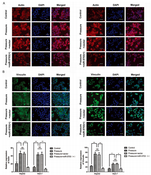 通過幽靈鉛筆環(huán)肽染色發(fā)現(xiàn),壓力增加 HepG2 和 Huh-7 細(xì)胞的細(xì)胞骨架微絲數(shù)量,而 miRNA-5703 過表達顯著減少其數(shù)量;免疫熒光顯示,壓力上調(diào)黏著斑蛋白紐蛋白表達,miRNA-5703 過表達則顯著抑制受壓細(xì)胞中紐蛋白的表達(圖8)。