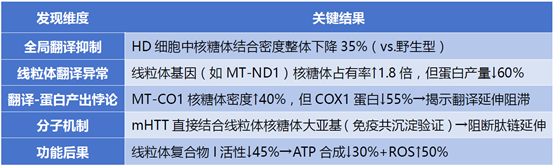 研究結論:該研究通過Ribo-seq/質譜雙模態量化,首次揭示亨廷頓病中“核糖體滯留卻蛋白荒廢”的線粒體翻譯悖論,提供了HD中線粒體翻譯缺陷的證據,揭示了線粒體翻譯調控的復雜性。發現的翻譯失調可能對HD的發病機制有重要影響,為未來的治療干預提供了新的視角。