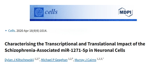 2. Kiltschewskij DJ, Geaghan MP, Cairns MJ. Characterising the Transcriptional and Translational Impact of the Schizophrenia-Associated miR-1271-5p in Neuronal Cells. Cells. 2020 Apr 18;9(4):1014.