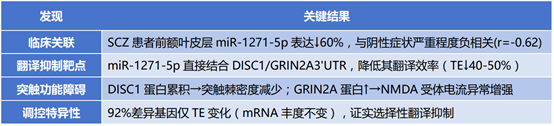 研究結論:miR-1271-5p作為翻譯“剎車器”,通過結合靶基因3'UTR直接抑制核糖體起始(非降解mRNA),其失靈導致突觸蛋白失控合成。該研究不僅揭示精神分裂癥的翻譯調控新機制,更提供了靶向RNA的精準干預思路。