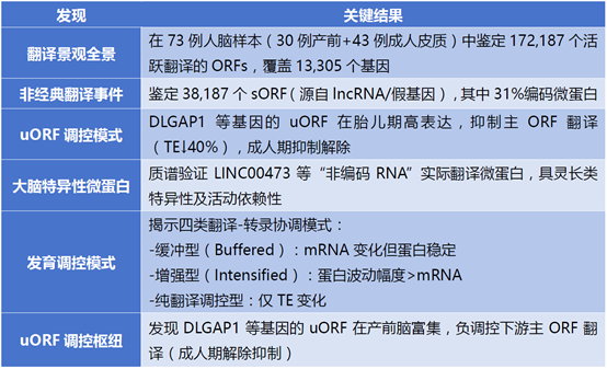 研究結論:該研究深入探討了人類大腦發育過程中RNA翻譯的動態變化。聯合使用核糖體印跡測序(Ribo-seq)和RNA測序(RNA-seq)技術繪制了人類大腦的翻譯圖譜,揭示了基因表達調控的關鍵節點,并識別了數千個之前未知的翻譯事件,包括產生人類大腦特異性微蛋白(microproteins)的小開放閱讀框(sORFs)。