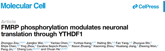 4. Zou Z, Wei J, Chen Y, Kang Y, Shi H, Yang F, Shi Z, Chen S, Zhou Y, Sepich-Poore C, Zhuang X, Zhou X, Jiang H, Wen Z, Jin P, Luo C, He C. FMRP phosphorylation modulates neuronal translation through YTHDF1. Mol Cell. 2023 Dec 7;83(23):4304-4317.e8.