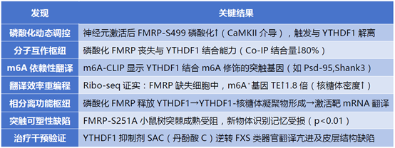 研究結論: FMRP缺失→YTHDF1持續激活→阻斷YTHDF1-mRNA互作(m6A⁺基因TE↑)→翻譯抑制→突觸可塑性失衡→脆性X綜合征表型。