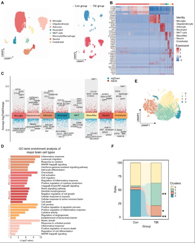 (A) 對6例TBI患者圍損傷皮層水腫組織中的42696個細胞以及4例無TBI對照個體皮層組織中的28974個細胞進行UMAP降維分析,展示整合分析鑒定出的主要細胞類型。